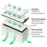 Le filtre principal absorbe et élimine les gaz toxiques et les odeurs incommodantes grâce à son charbon actif haute qualité.